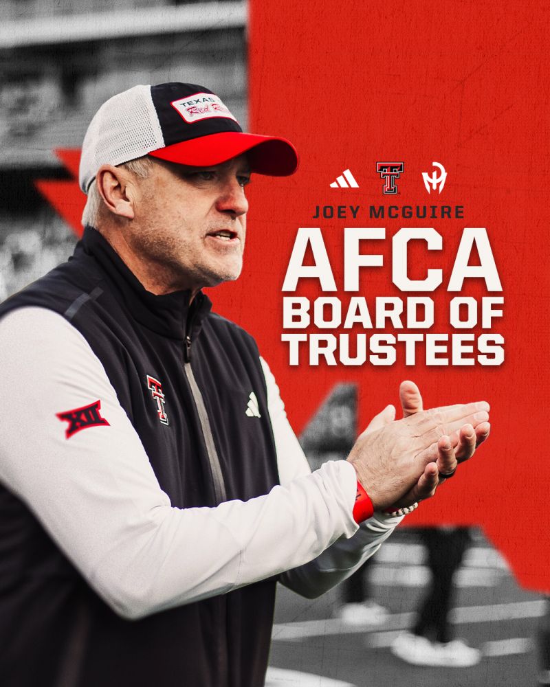 Texas Tech head coach Joey McGuire, New Mexico head coach Jason Eck, San Diego State head coach Sean Lewis, Montana State head coach Brent Vigen, Michigan State head coach Pat Fitzgerald, and Old Dominion head coach Ricky Rahne have been named to the Board of Trustees of the American Football Coaches Association (AFCA). Kentucky wide receivers coach Joe Price III has also been named to the board as an ex…