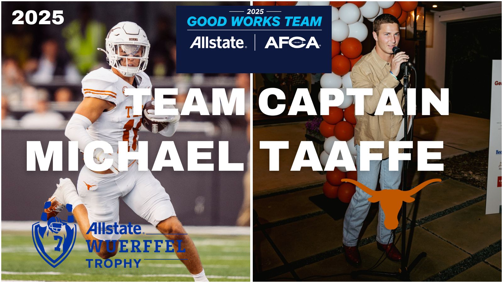 University of Texas senior defensive back Michael Taaffe wins the 2025 Allstate Wuerffel Trophy for leadership in community service